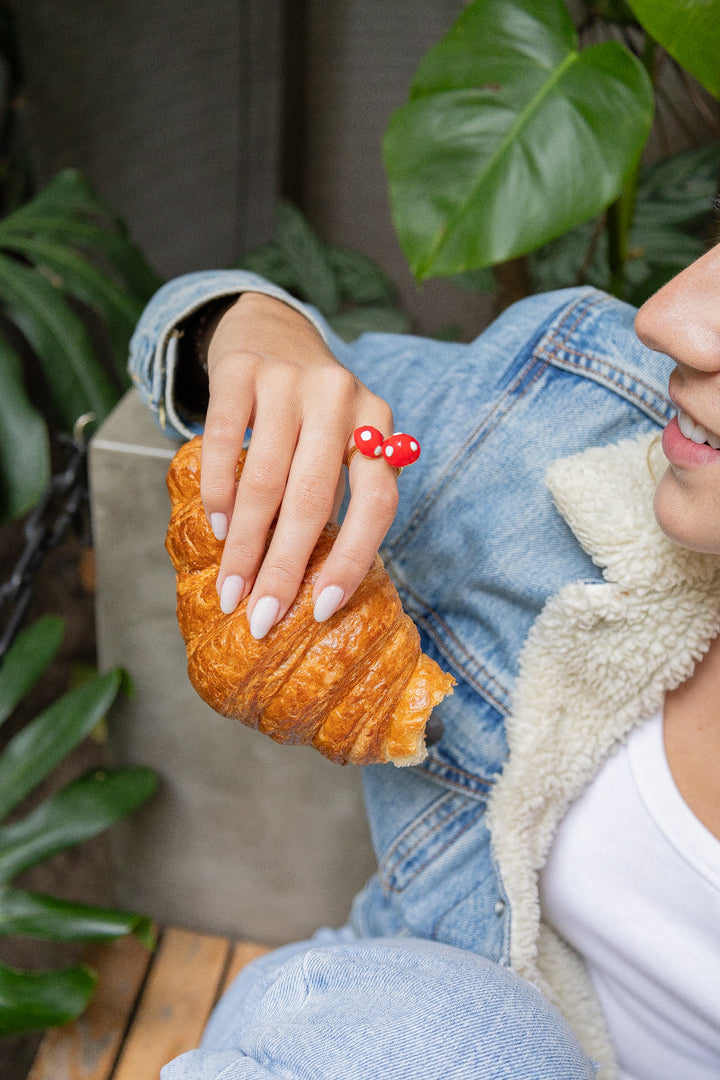 - Incluye: 1 anillo dorado con tres honguitos.