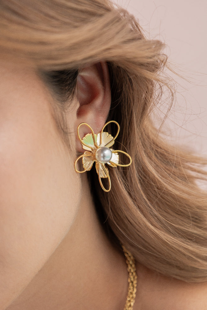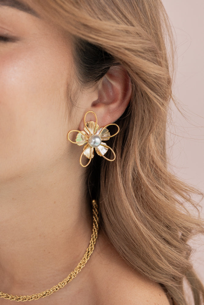 - Aretes elaborados en Acero con baño de oro de 24k y perla.