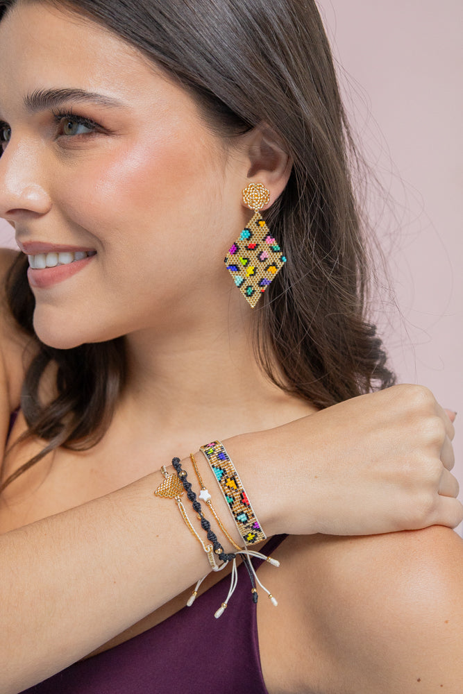 - El combo incluye 1 par de aretes tejidos y 1 set de pulseras tejidas. (Como se ve en la foto).