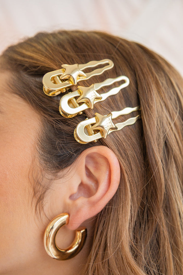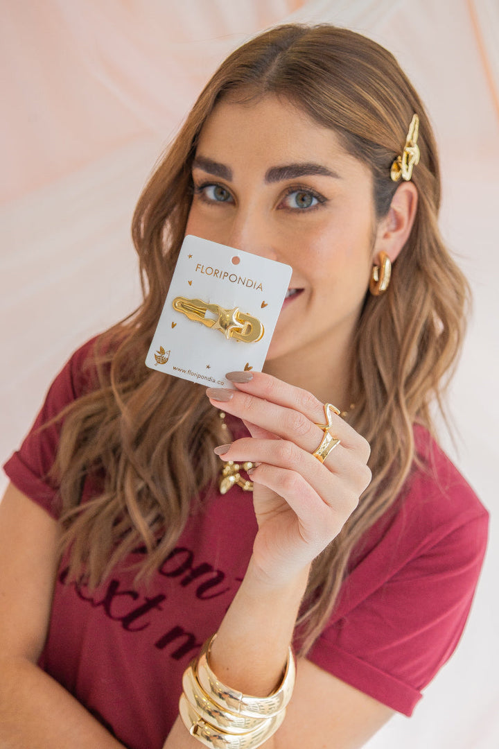 - Hebilla dorada para el cabello en acero con baño en oro de 24k. Nuestras hebillas doradas son el accesorio ideal para realzar tu estilo. Están elaboradas en acero con baño en oro de 24k, lo que garantiza brillo, durabilidad y un acabado sofisticado. Perfectas para usar solas o combinarlas con otros diseños y crear estilos únicos que reflejen tu personalidad.