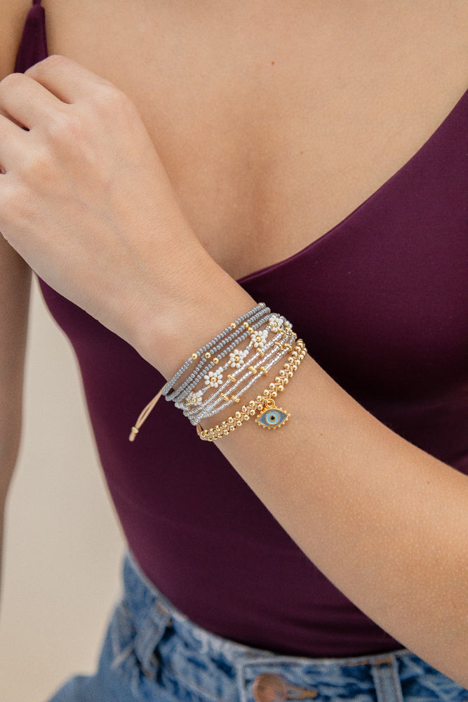 - Set de pulsera tejida con mostacilla checa y balines, elásticas y con nudo corredizo.